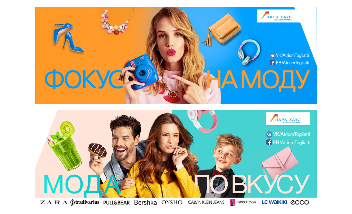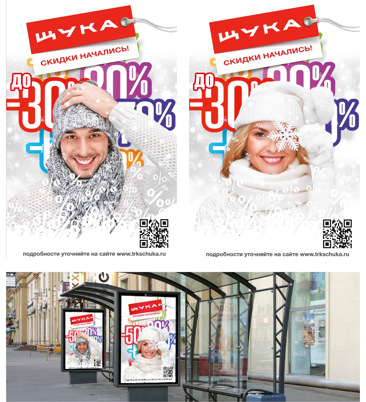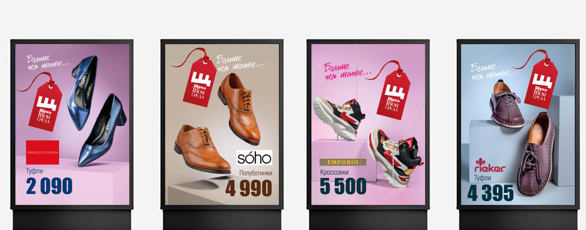 Серия баннеров для магазинов обуви в ТРК ЩУКА. Печатная версия.