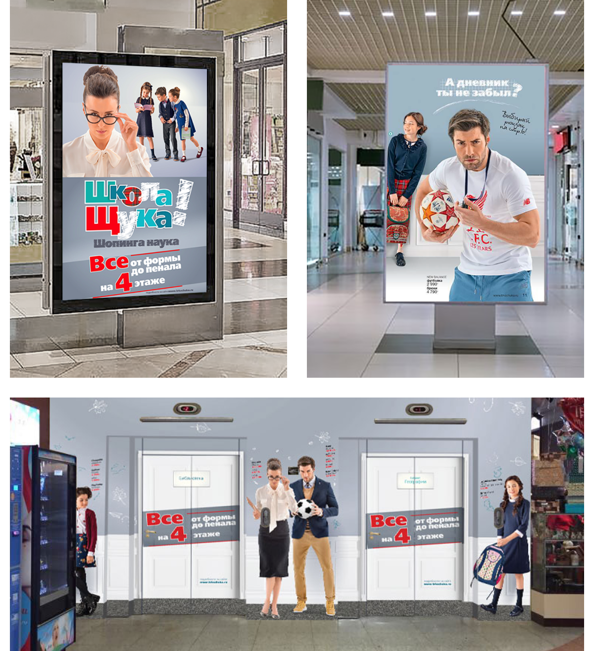 Серия баннеров школьных товаров в ТРК ЩУКА. Печатная версия.